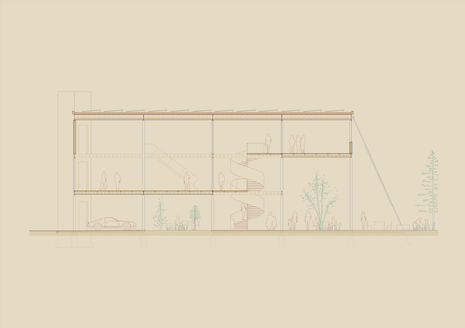 Its strategy is to transform a commercial building - usually an indifferentiated box - into a democratic threshold offering a public space. This vision is realized through the development of a permeable space that blends outdoor and indoor circulation, linking 7’000 m2 of commercial areas with the surrounding environment. At its core, the design responds to the powerful presence of the river and its banks. In synergy with this natural feature, the proposal envisions a vast protected riverside park, supported by a building of infrastructural scale.